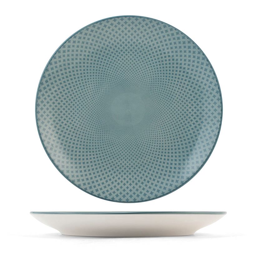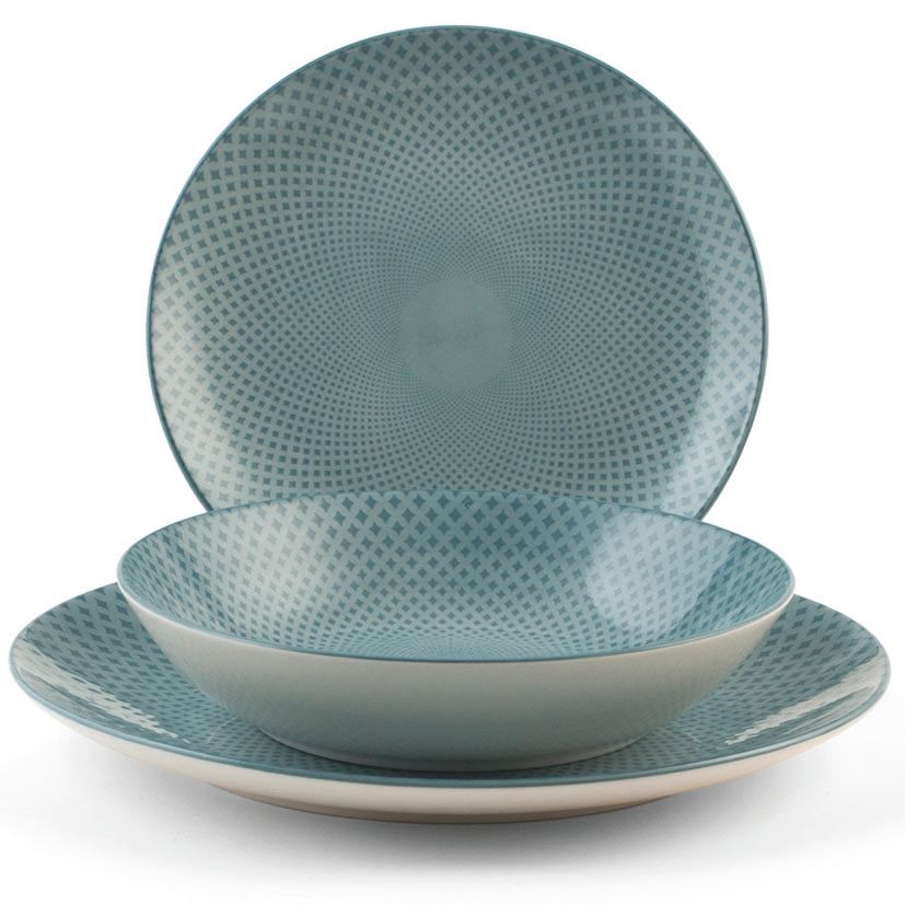 Conjunto de jantar de porcelana decorada com 18 peças. Pode ser lavado na lava-louças e usado no micro-ondas.