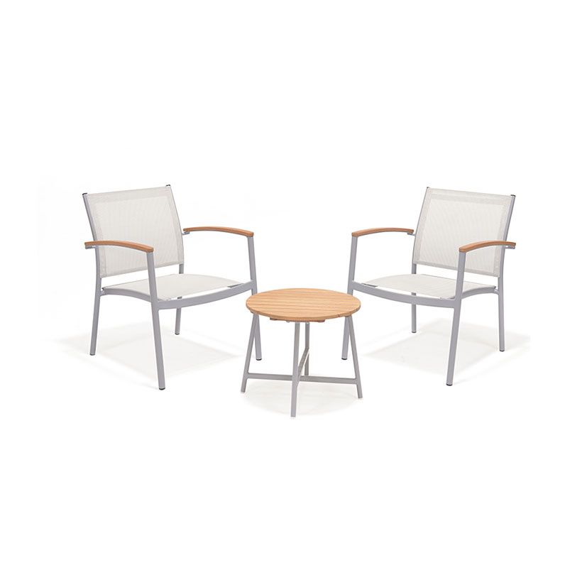 Estrutura em alumínio cinza fosco. Assento e encosto em textilene bege. Apoios de braço e tampo em madeira de eucalipto com acabamento imitando teca.