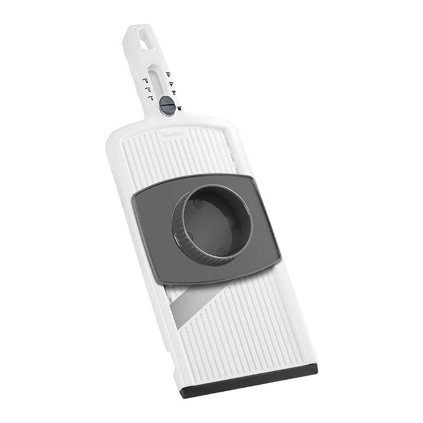 Corpo em plástico ABS e lâminas em aço inoxidável. Sistema de travamento e apoio antiderrapante. 6 ajustes de espessura. Cabo ergonômico e protetor/prensa.