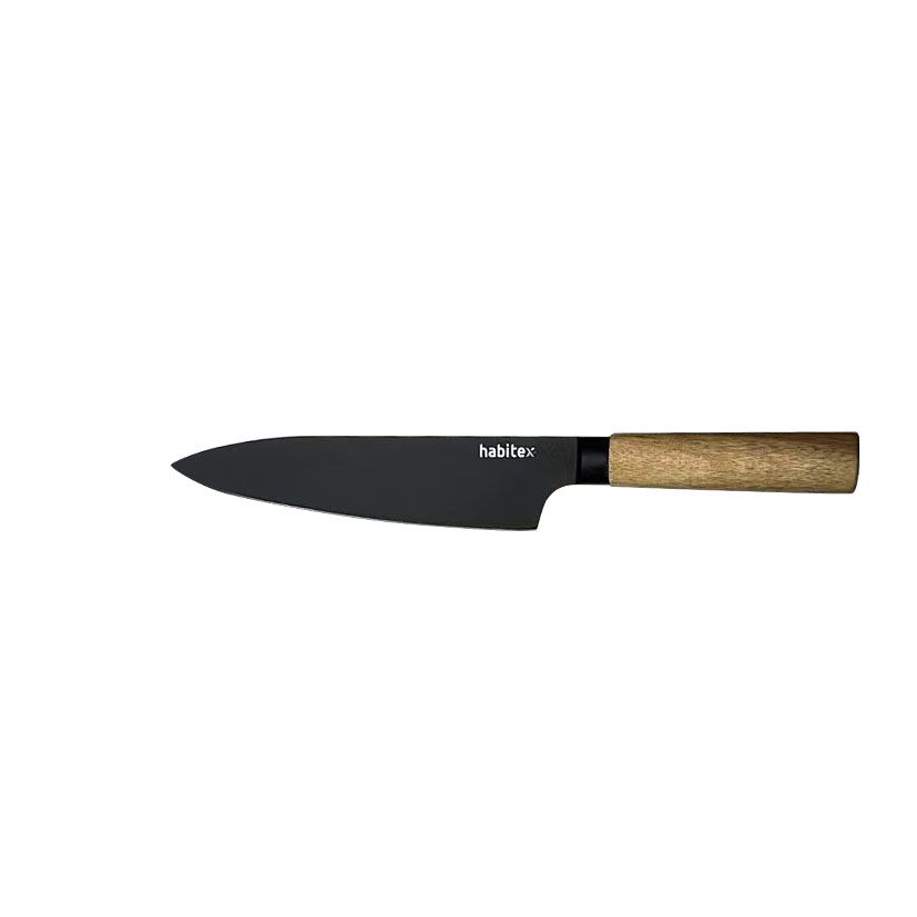Lâmina em aço inoxidável de alto carbono com acabamento revestido. Afiada com precisão. Cabo em madeira de acácia.