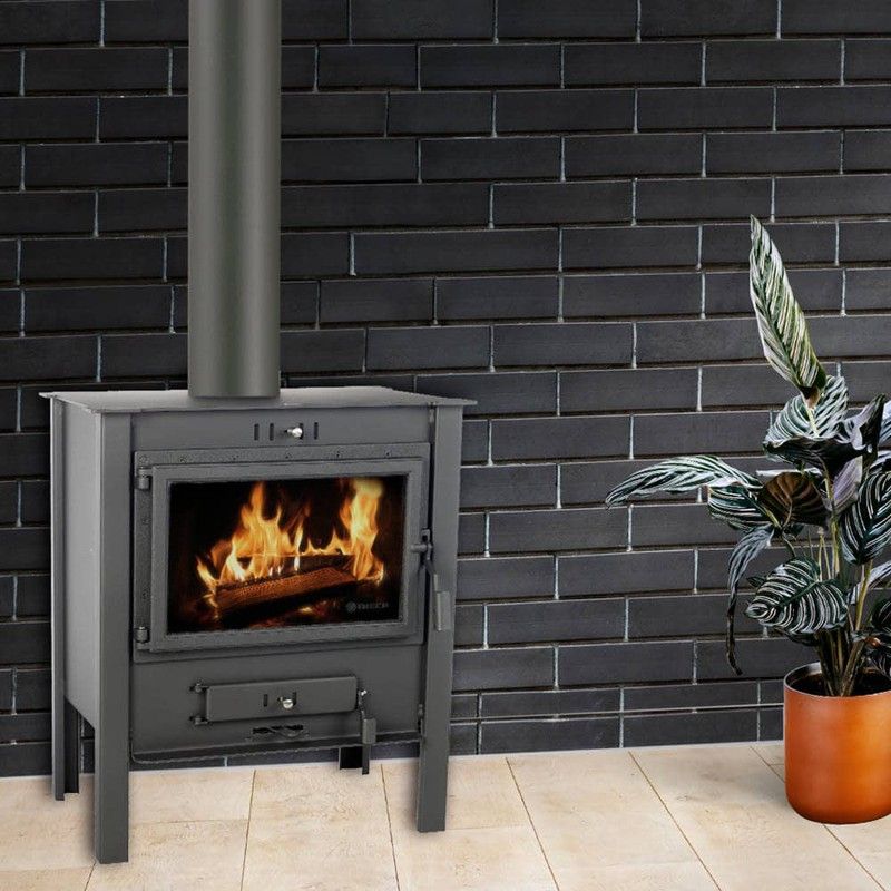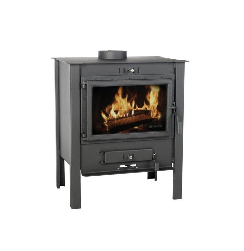 Fogão ECODESIGN com porta em ferro fundido. Tripla combustão. Possui câmara de combustão revestida com vermiculita refratária e sistema de limpeza do vidro. Inclui câmara de combustão dupla em aço, com 3 e 4 mm de espessura.