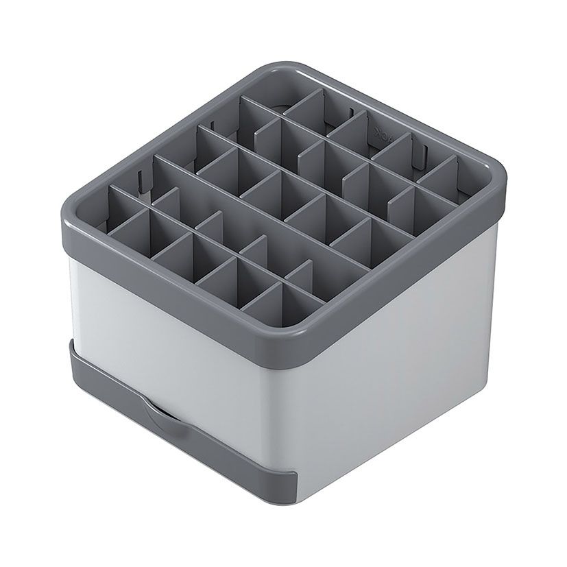 Plástico ABS. Personalizável: você pode ajustar o número de compartimentos até um máximo de 25. Gaveta inferior deslizante com dupla função: serve como apoio para utensílios ou suporte para celular.