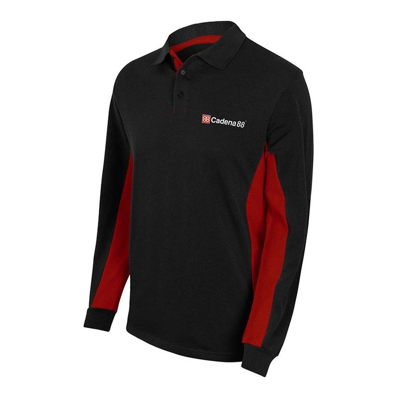 60% poliéster e 40% algodão. Cor vermelha nas laterais e interior dos botões e gola e preta no restante. Fecho central com botões. Gola e bainha da manga caneladas. Logótipo Cadena 88 no peito.
