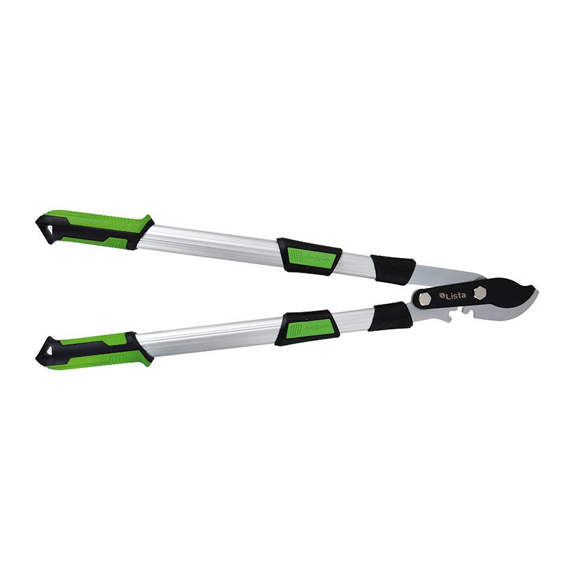 Braços telescópicos tubulares de alumínio. Corte deslizante (Bypass). Sistema de redução de potência (via engrenagens). Lâmina com revestimento antiaderente. Cabos ergonômicos e antiderrapantes.